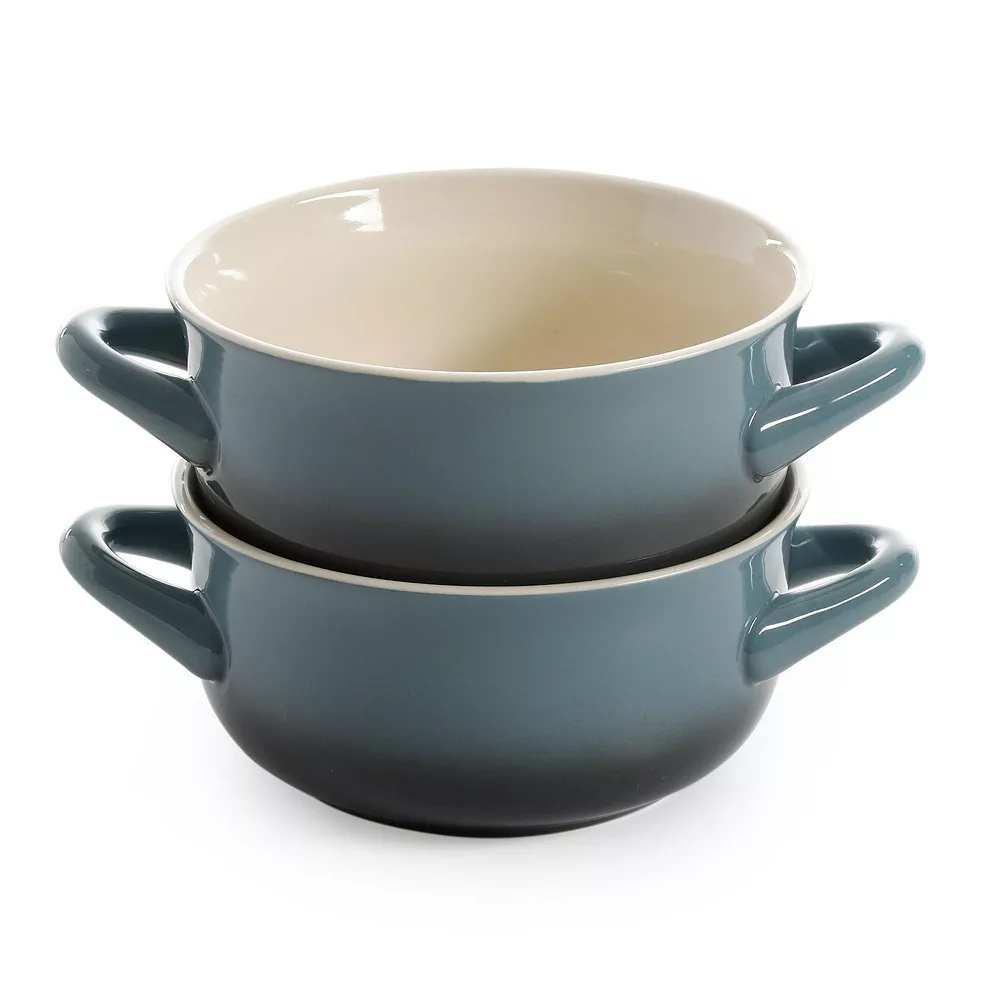 Leave your dinner guests in admiration of the glossy reactive glaze on this gorgeously finished gradient stoneware. This pair of 30-ounce soup bowls offers more than just style. With dual handles, you’re able to comfortably transport hot foods from your kitchen to your table with ease. To make cooking and reheating a breeze, the durable stoneware stays cool to the touch when placed in your microwave and is rated for use in your oven up to 325 degrees Fahrenheit.