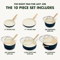 - 2-qt. saucepan with lid, 6-qt. stock pot with straining lid, 8-qt. stock pot with lid, 8-in. and 11-in. frying pans & 2.8-qt. sauté pan with lid