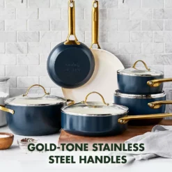 - Sleek, gold-tone stainless steel handles give you a comfortable grip