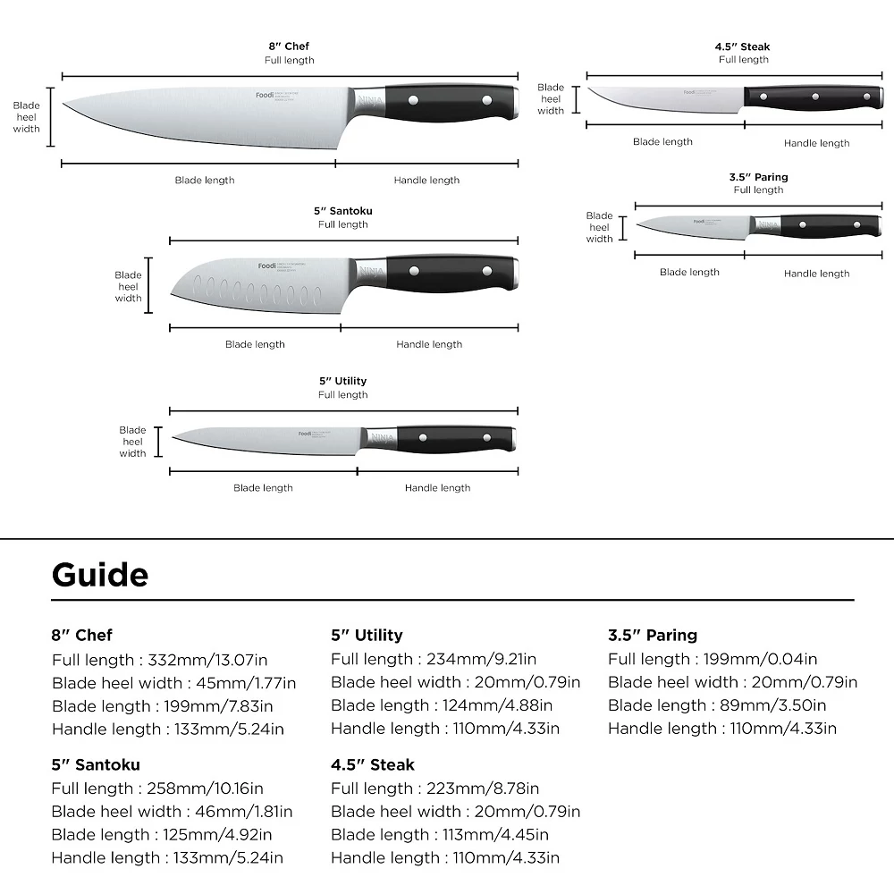 - 8-in. Chef knife, 5-in. Santoku knife, 5-in. Utility knife, 3.5-in. Paring knife, (6) 4.5-in. Steak knives, Shears, Knife Block with NeverDull Technology