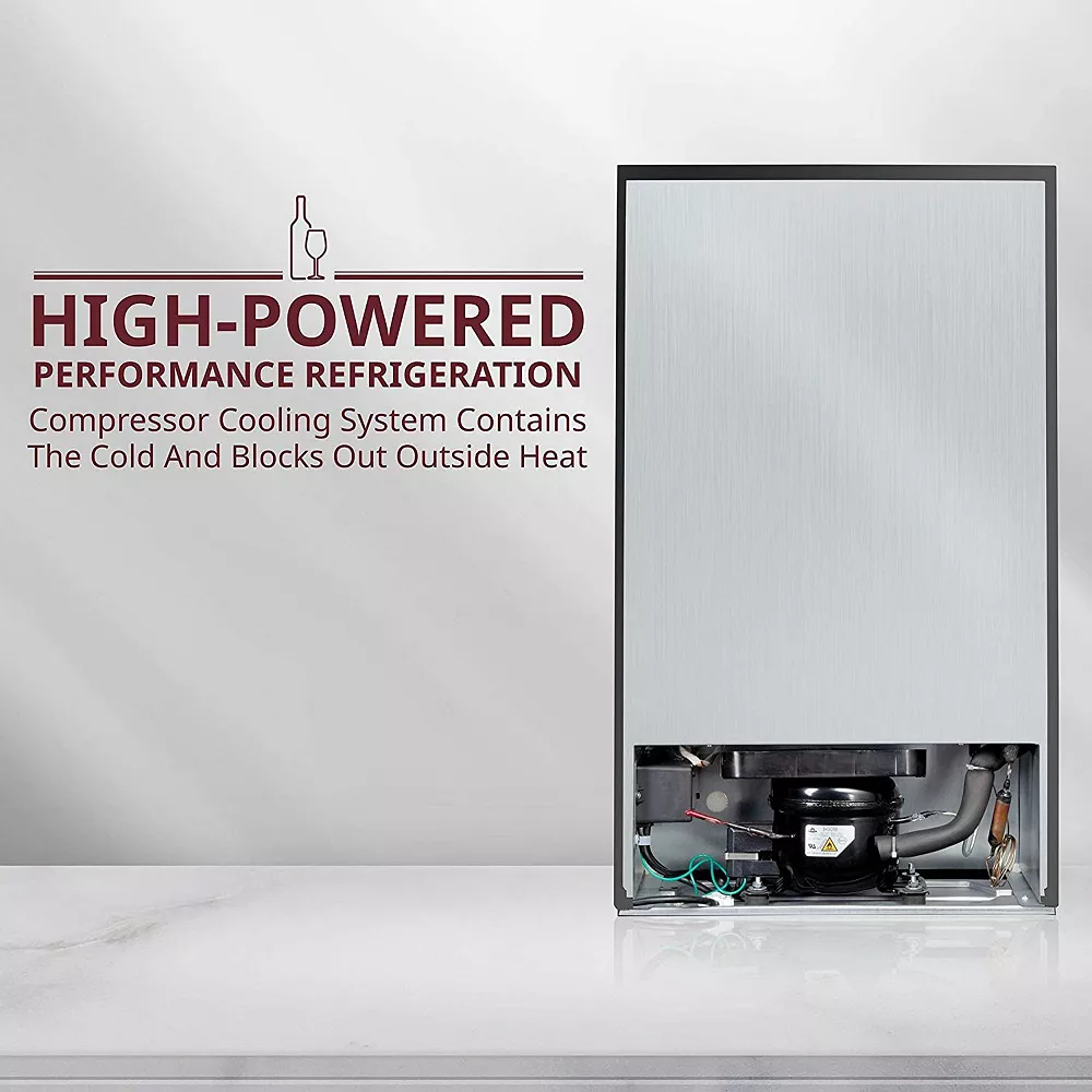 A wine refrigerator freestanding has never looked better! With a powerful wine cooler refrigerator compressor, you can place this small wine cooler in any room where you like to have social parties. A wine cooler where you can store your favorite drinks. This mini wine fridge black stainless steel exterior fits in any room. Arrange or storage both your champagne and red or sparkling wine bottles. The freestanding design is safer than a regular countertop wine fridge or small wine fridge.
