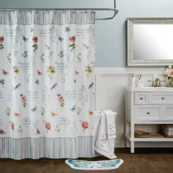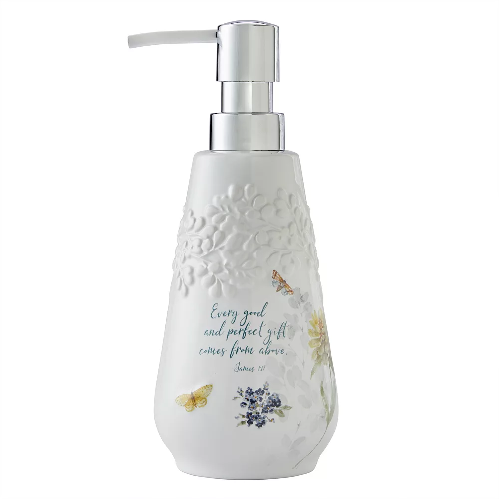 - Add inspiration and beauty to your bath with the Inspirational Meadows collection. This ceramic dispenser features a raised floral design, colorful floral print and James 1:17 bible verse. It can be used to hold lotion or liquid soap.